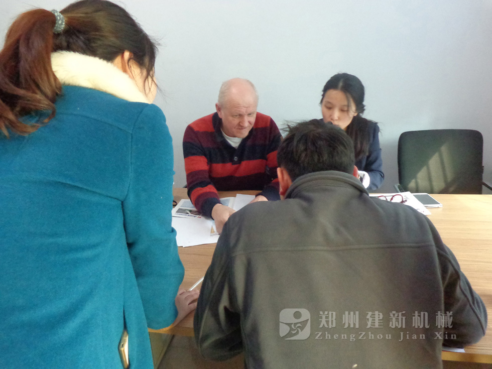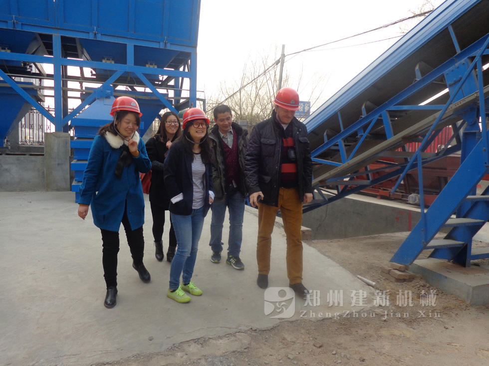 2014年11月,來自俄羅斯的客戶來到鄭州建新公司簽訂了兩套時產120方混凝土攪拌站設備的大訂單,下圖為建新公司銷售部劉經理、經理帶客戶參觀建新公司的生產車間及成品貨場。